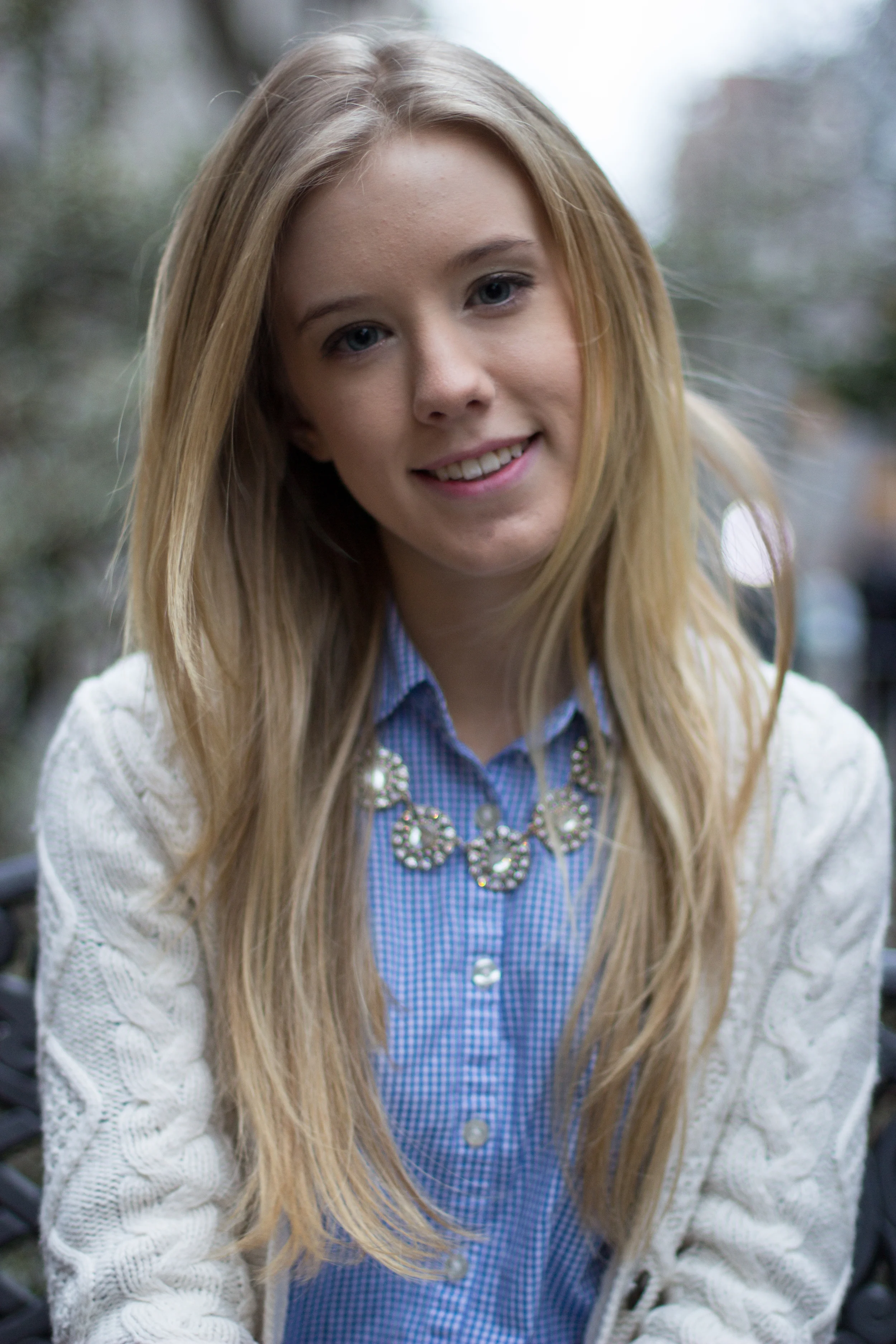 (I wore a Vineyard Vines blue gingham button-down, a Madewell cream cable-knit cardigan, JCrew navy blue Minnie ankle pants, JCrew anchor belt, brown Michael Kors flats, and a JCrew circle necklace)